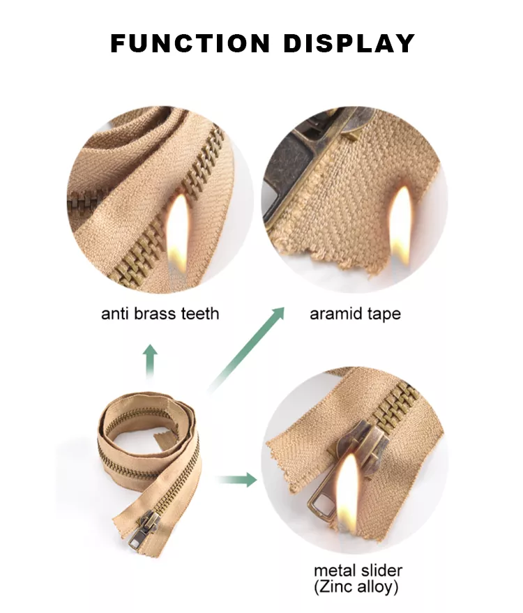 A TRC tűzálló fém cipzár önkioltó tulajdonságú égésgátló szalagot használ, amely megakadályozza, hogy megégjenek vagy meggyulladjanak a levegőben, ötvözve a biztonságot és a tartósságot. Kiváló hőállósága biztosítja, hogy még rövid ideig tartó, 300°C-os magas hőmérsékletnek kitéve sem zsugorodik, nem válik törékennyé és nem olvad meg, így ideális választás magas védelemmel járó alkalmazásokhoz.
