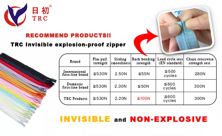 Minden TRC láthatatlan, robbanásbiztos cipzárt gondosan ellenőriznek a gyártás során, a nyersanyag kiválasztásától a végső összeszerelésig. A szakítószilárdságra, a simaságra és a tartósságra vonatkozó szigorú tesztek biztosítják az egyenletes teljesítményt, és megbízható cipzárt biztosítanak, amely megfelel a nemzetközi minőségi szabványoknak.