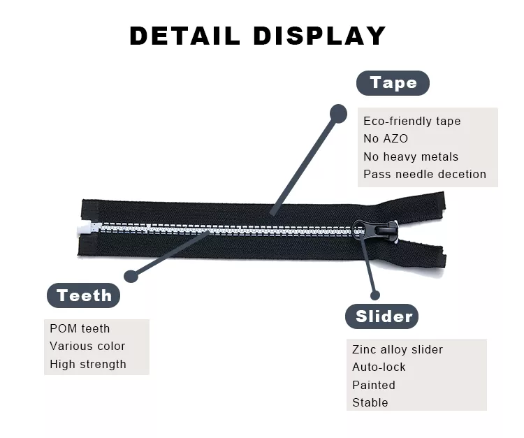A TRC újrahasznosított műanyag cipzárok nagy szilárdságú, öntött műanyag fogakból készülnek, és kiválóan ellenállnak a deformációnak, a kopásnak és az ismételt használatnak. A könnyű és tartós poliészter szalag emellett javítja a cipzár rugalmasságát és kényelmét, így ideális választás ruházati cikkekhez, kültéri felszerelésekhez, poggyászhoz és egyéb olyan alkalmazásokhoz, ahol a teljesítmény és a tartósság kritikus fontosságú.
