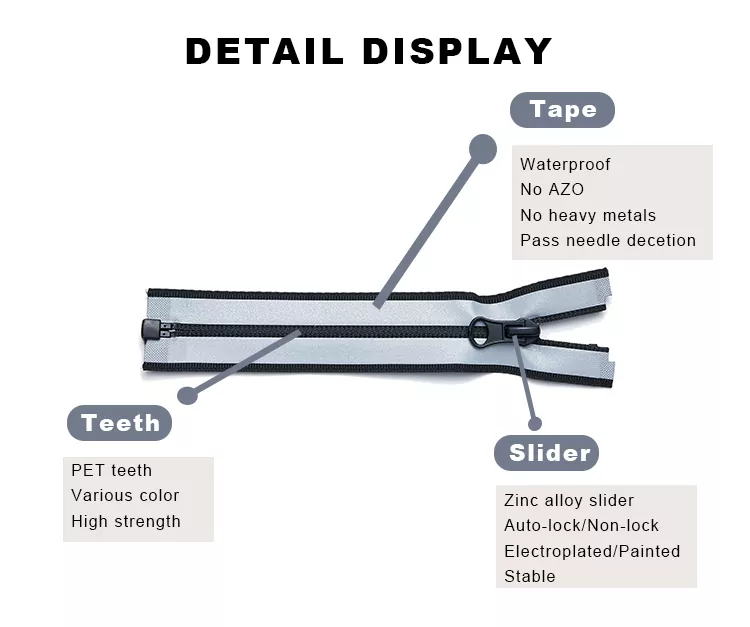 Megbízható kínai cipzárgyártóként a TRC szigorú minőség-ellenőrzést tart fenn a teljes gyártási folyamat során, az anyagválasztástól a vízálló membránok alkalmazásáig. Ezen túlmenően az OEM/ODM testreszabási lehetőségeink lehetővé teszik a színek, bevonattípusok, csúszka stílusok és cipzárméretek megadását, amelyek testreszabott megoldásokat biztosíthatnak, amelyek megfelelnek a globális minőségi és tervezési szabványoknak.